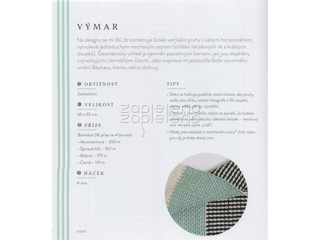 Postup u každého projektu je doplněný o rozkres, tipy barevných kombinací a rady, jak si přizpůsobit velikost. Vzory v knize jsou jednoduché, háčkují se rychle a není třeba zapošívat hodně konců. A samozřejmě tu nechybí vysvětlení základních technik háčkování.